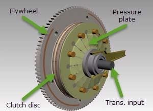 The clutch system is made up of the clutch disc, flywheel, pressure plate, throw-out bearing, pilot bearing, and clutch fork. The flywheel and pressure plate are bolted together and both are attached to the crankshaft of the engine. The clutch disc is located in between the flywheel and pressure plate and is connected to the splined input shaft of the transmission. The clutch disc has a friction surface on each face that comes in contact with the smooth surfaces of the flywheel and pressure plate.