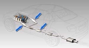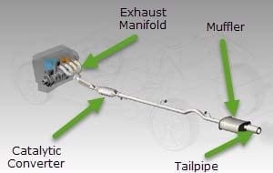The image on the right is a typical exhaust layout that you would find on a car equipped with a four cylinder engine. Exhaust is collected from the cylinder head by the exhaust manifold. It diverts gases from each cylinder into a single pipe. Exhaust gases travel through a catalytic converter where harmful components such as Carbon Monoxide and Nitrogen Oxide are converted to inert gases.